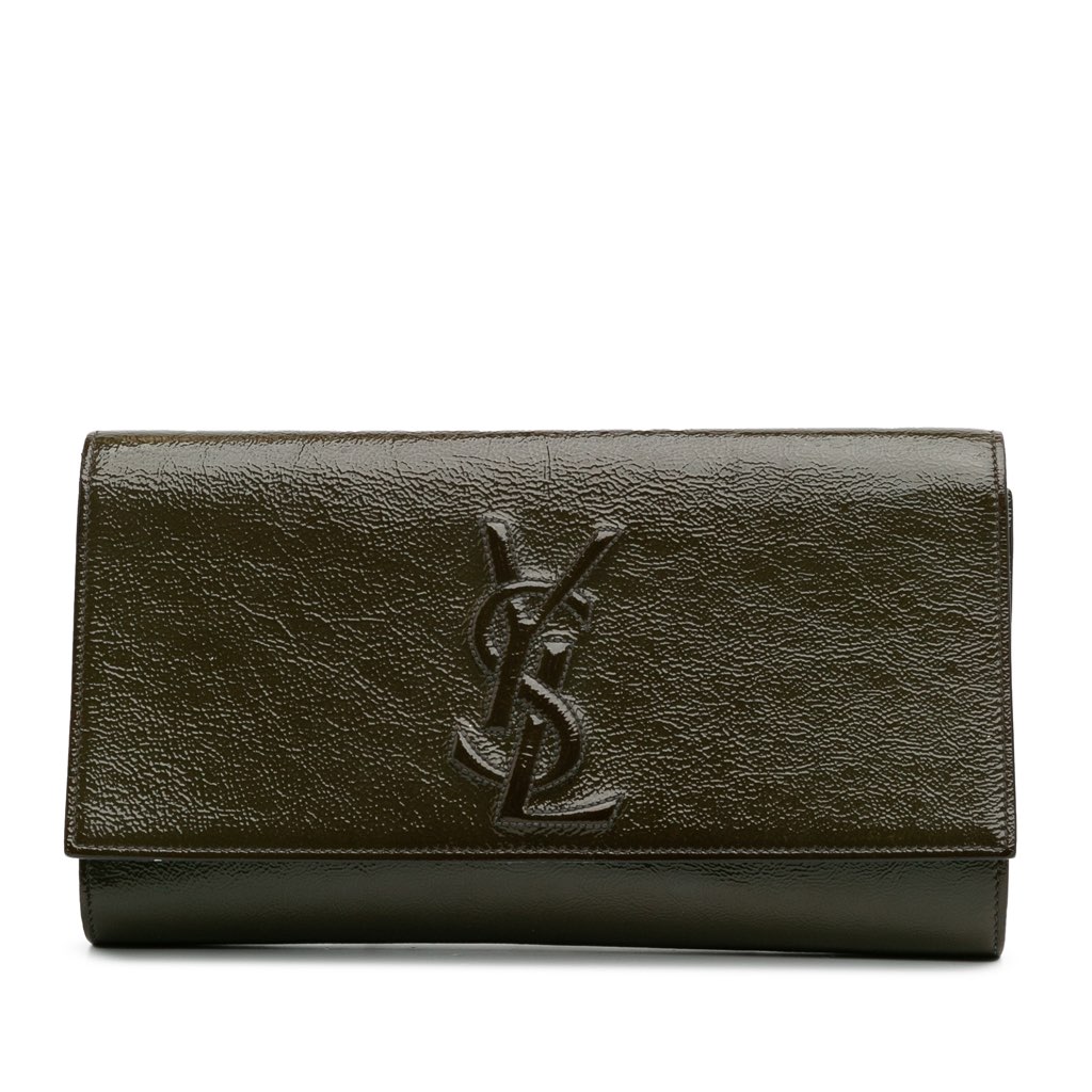The Belle De Jour clutch bag features a patent leather body, a flap with magnetic snap closure, and an interior slip pocket.