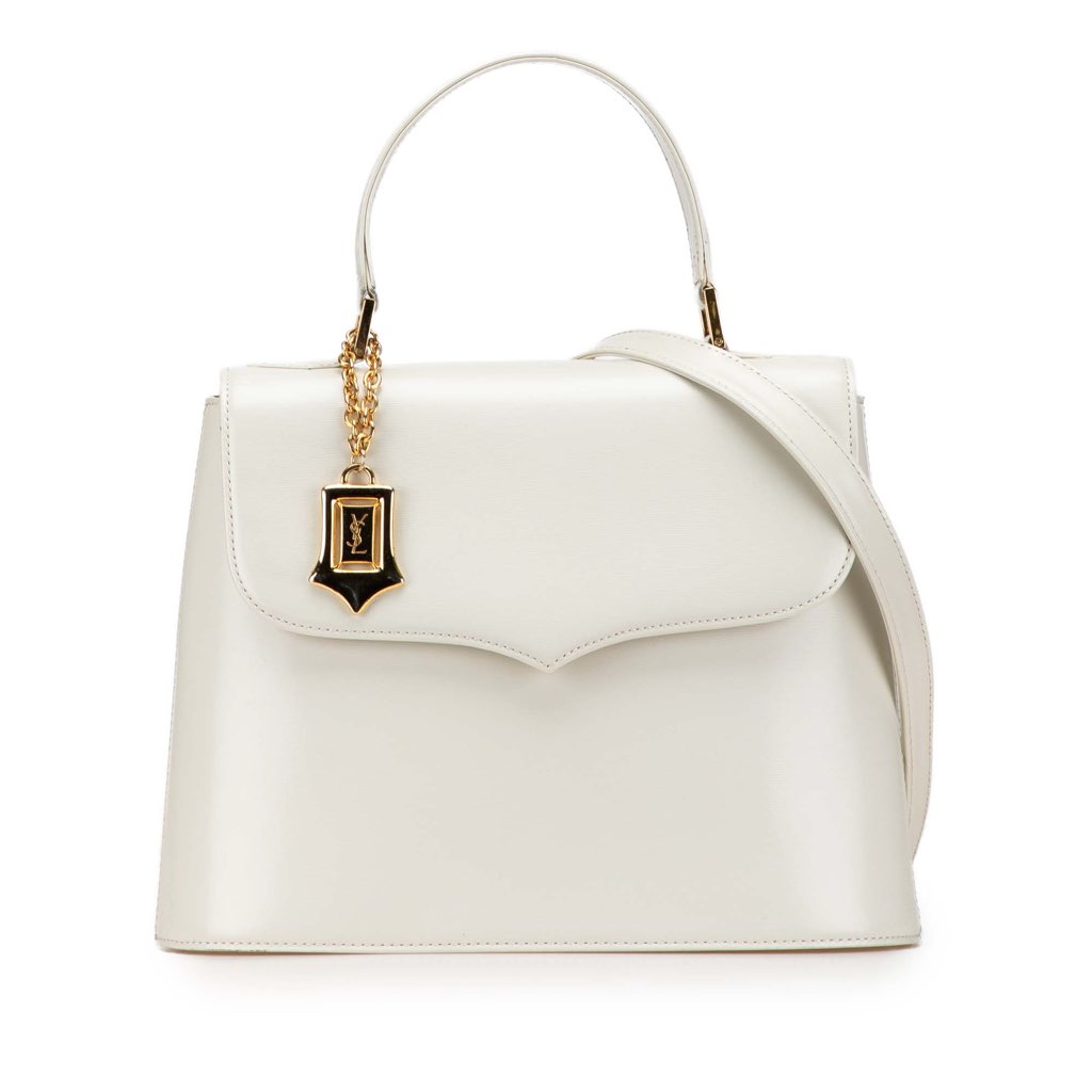 This satchel features a leather body, a flat leather handle, a detachable and adjustable flat leather shoulder strap, a front flap closure, and an interior zip pocket.