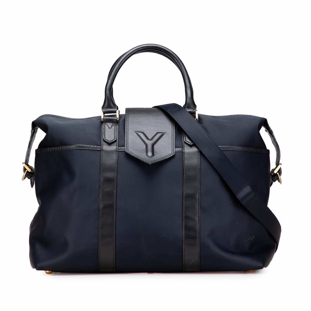 This travel bag features a nylon body with leather trim, rolled leather handles, a detachable nylon strap, a top zip closure with magnetic button flap, exterior front slip pockets, and an interior zip pocket.