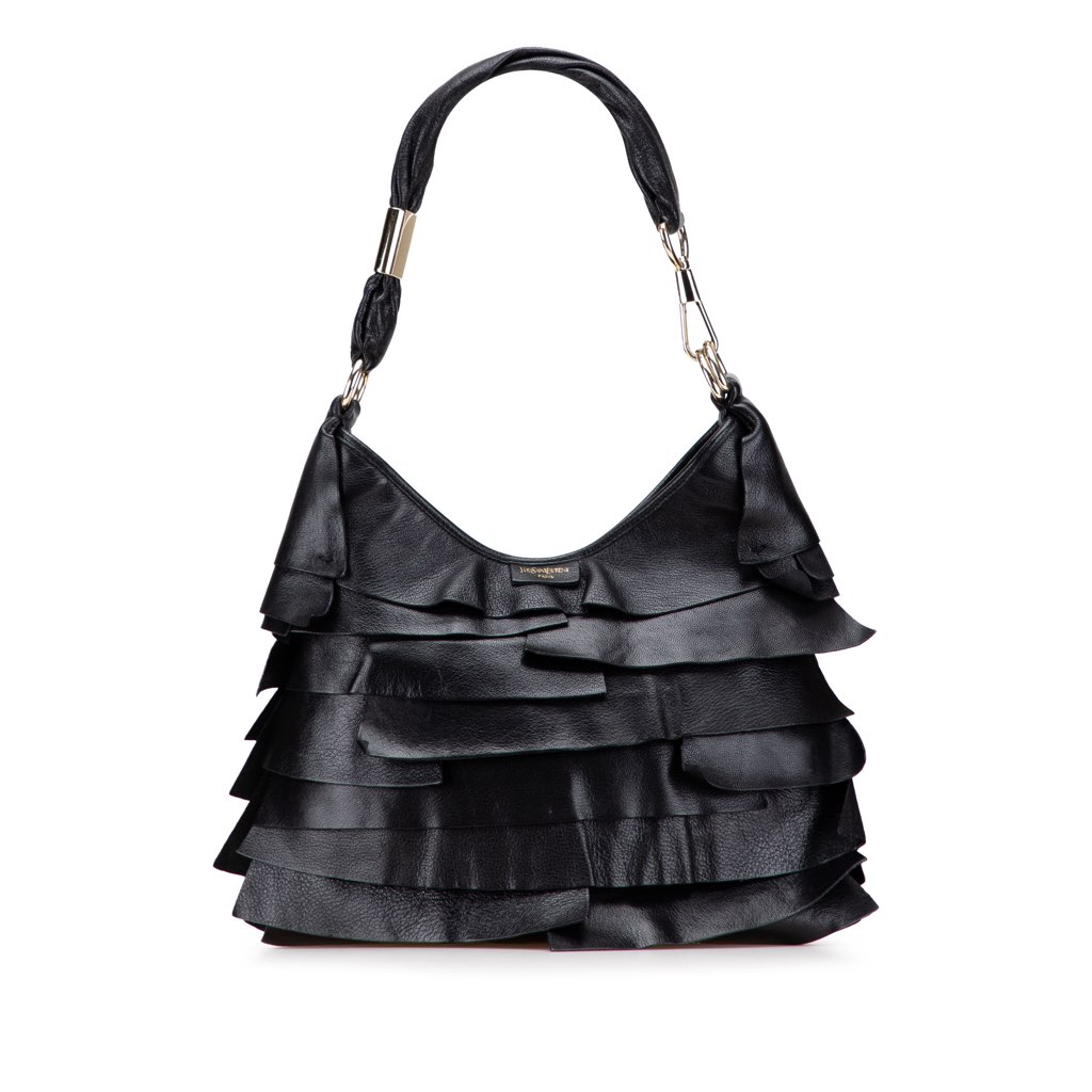 The Saint Tropez features a ruffled leather body, a flat leather strap, an open top magnetic snap closure, and interior zip and slip pockets.